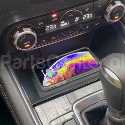 Bezdrátová nabíječka mobilních telefonů, plně kompatibilní s přihrádkou řadicí páky v modelu Mazda GJ 6. generace. Nabíječka umožňuje rychlé bezdrátové nabíjení s výkonem až 15 W.