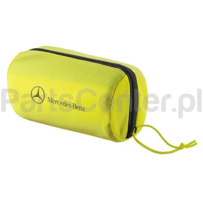 A bright yellow vest with fluorescent stripes packed into a compact fabric pouch.