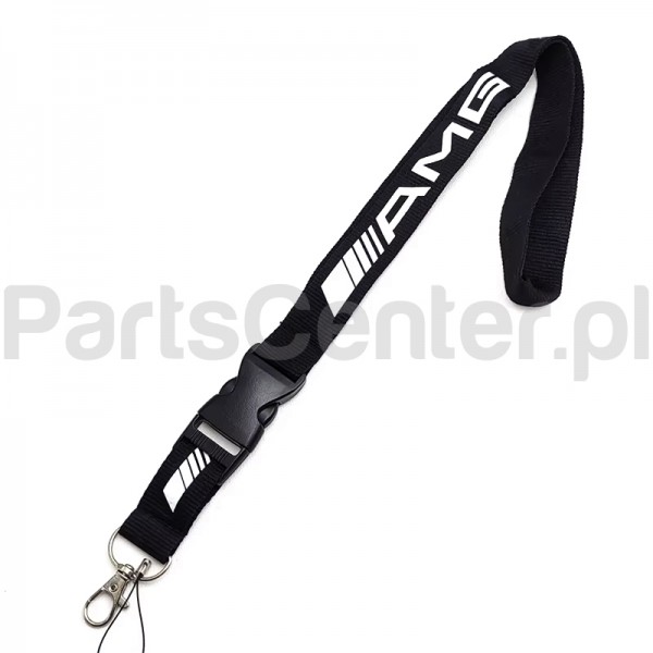 The Mercedes AMG lanyard allows you to carry items with you. It features a plastic safety clasp with a standard metal snap hook. Its modern design is accentuated by the black and white color scheme characteristic of AMG products.