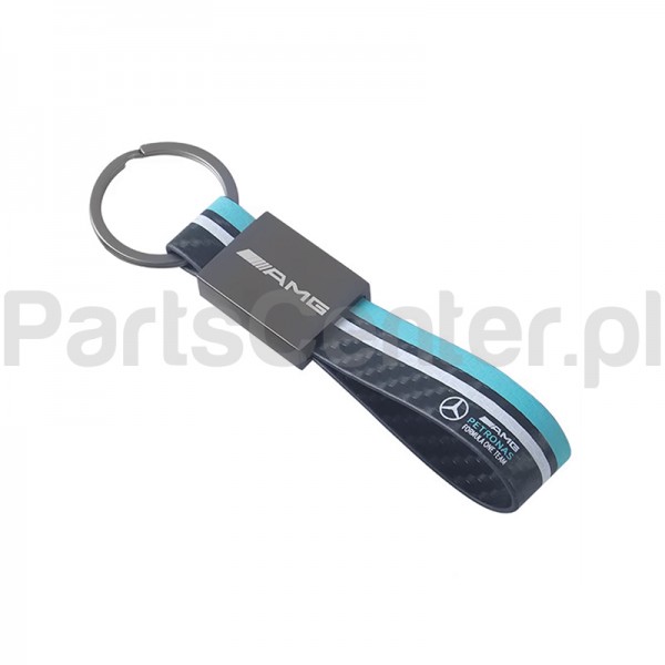 Mercedes key ring from the AMG Formula One Team collection in its characteristic black and green colors and carbon styling.