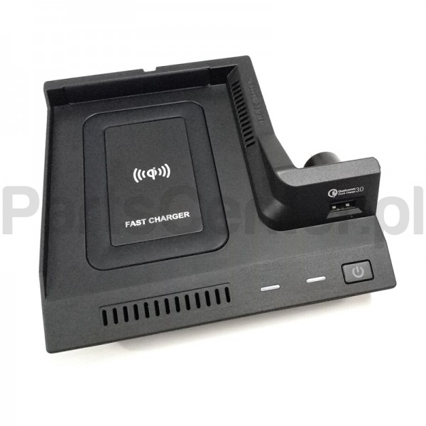 A wireless mobile phone charger, fully compatible with your car's glove compartment. It allows for simultaneous wireless charging and charging from a powerful Quick Charge 3.0 USB port.