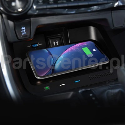 Wireless mobile phone charger, fully compatible with the gear shift compartment in the Toyota RAV4 generation V. The charger allows for simultaneous wireless charging and charging from the efficient Quick Charge 3.0 USB port.