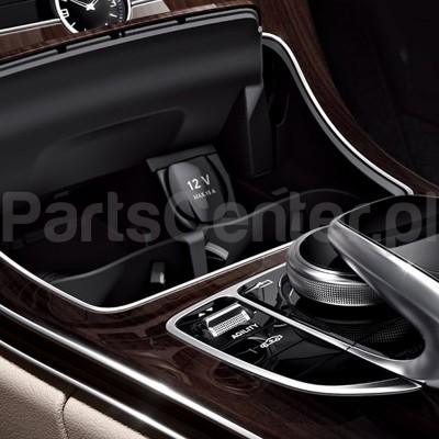 A wireless mobile phone charger, fully compatible with the glove compartment of the Mercedes E-Class (W213). It allows for simultaneous wireless charging and charging via the powerful Quick Charge 3.0 and USB-C ports.